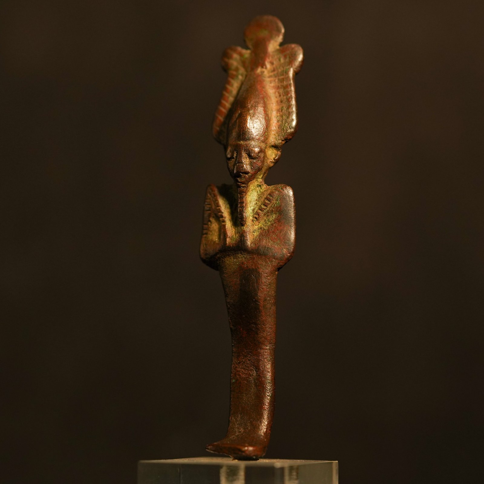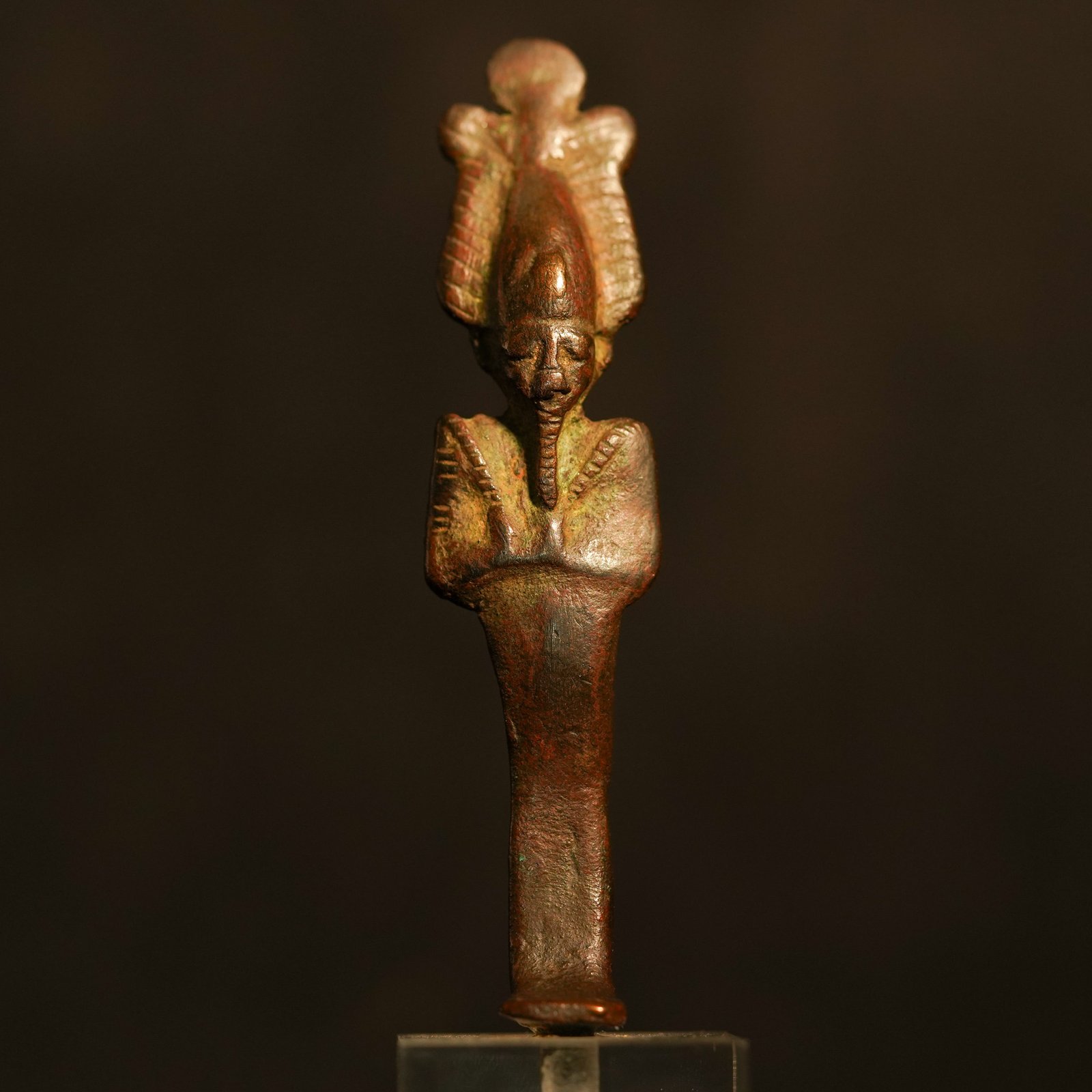 Osiris embodies resurrection and the cycle of regeneration. During the Late Period and the Ptolemaic period, his cult became widespread, which explains the large number of bronze figurines of this type found in hiding places or favissae within temples.