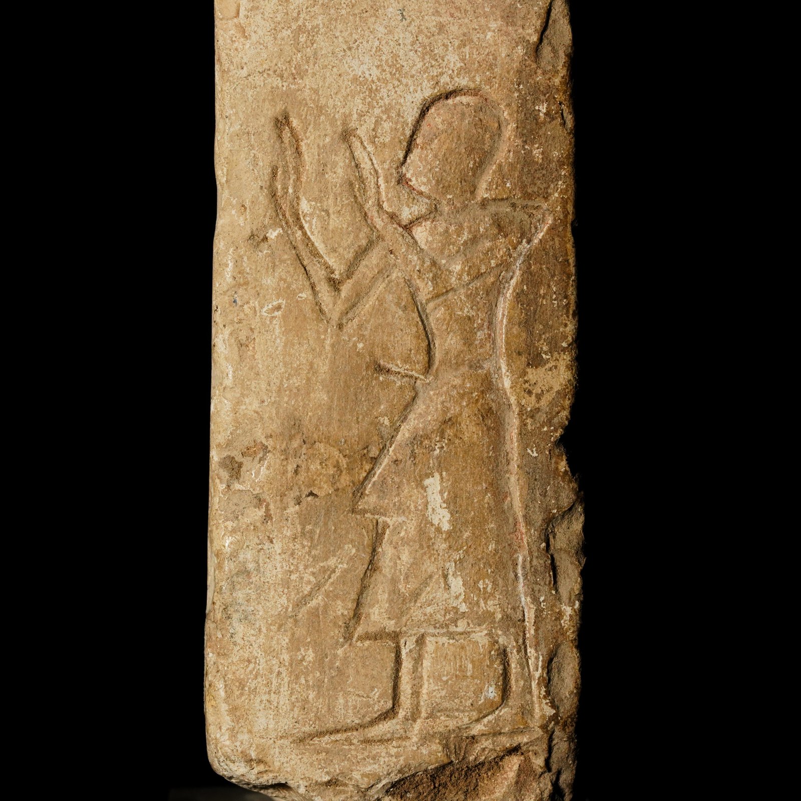 On the sides of the naos, male figures are depicted in profile with their arms raised in a gesture of worship (dwꜣ), iconography characteristic of the faithful or devotees in an attitude of worship. These figures reinforce the votive function of the piece, probably conceived as an offering deposited in a temple context linked to the cult of Ptah.