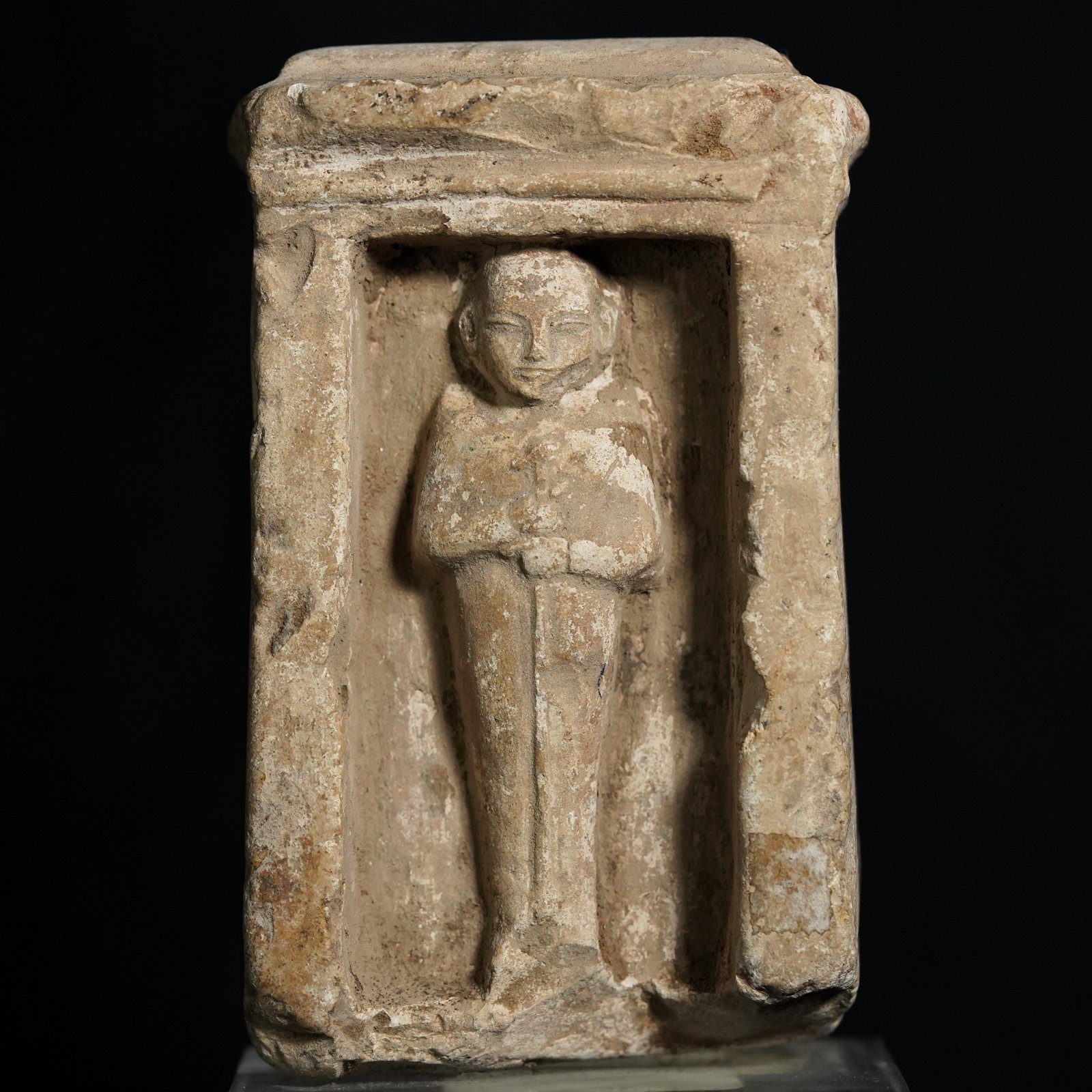 The rectangular niche reproduces a miniature sanctuary, reinforcing the piece’s cultic function. The modeling is schematic but effective, typical of votive productions from the Late Period, where iconographic clarity takes precedence over naturalistic detail.