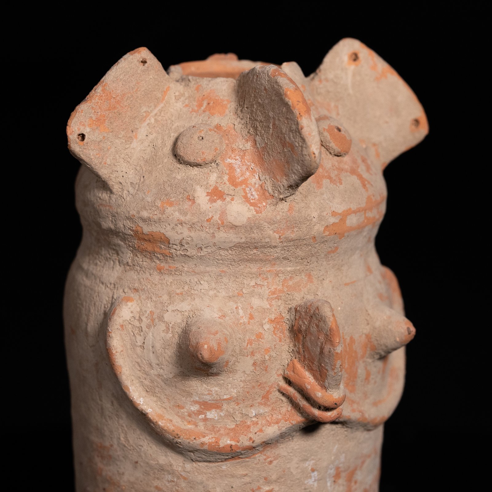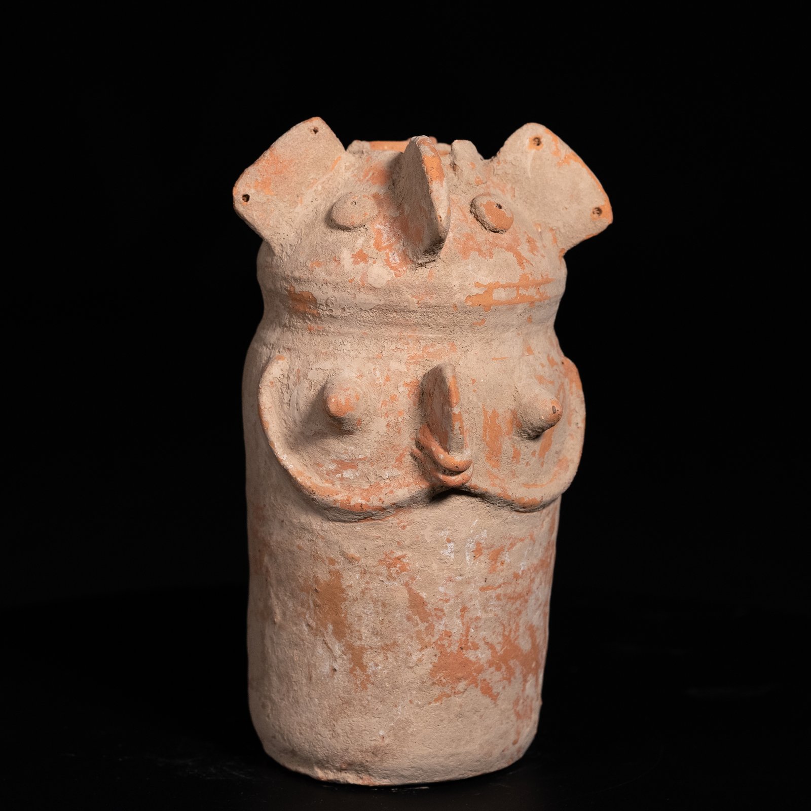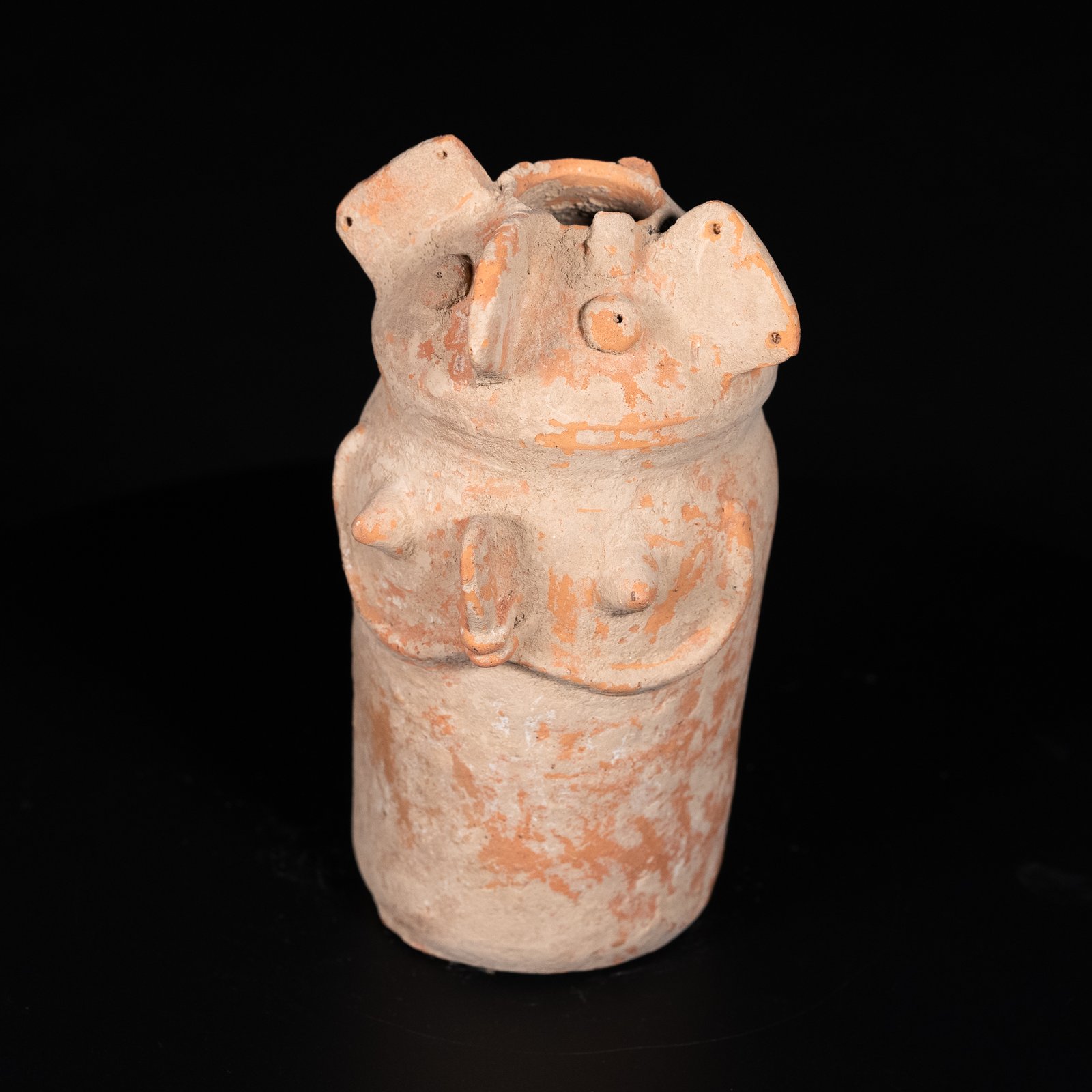Terracotta vessel made in sinuous shapes resembling a female form with her arms folded under her chest and an opening in her head that simulates an up-do. Its function could be to contain water for ritual libations or some kind of cereal grain as a food offering. In addition, there are various shapes that indicate that they may also have contained incense. These sculptures are considered to have had a votive function, as a large number of them have been found in sacred deposits, so they are thought to have an apotropaic function. The apotropaic function of these pieces was to protect fertility and motherhood. It would undoubtedly be a key ritual element for fertility.
