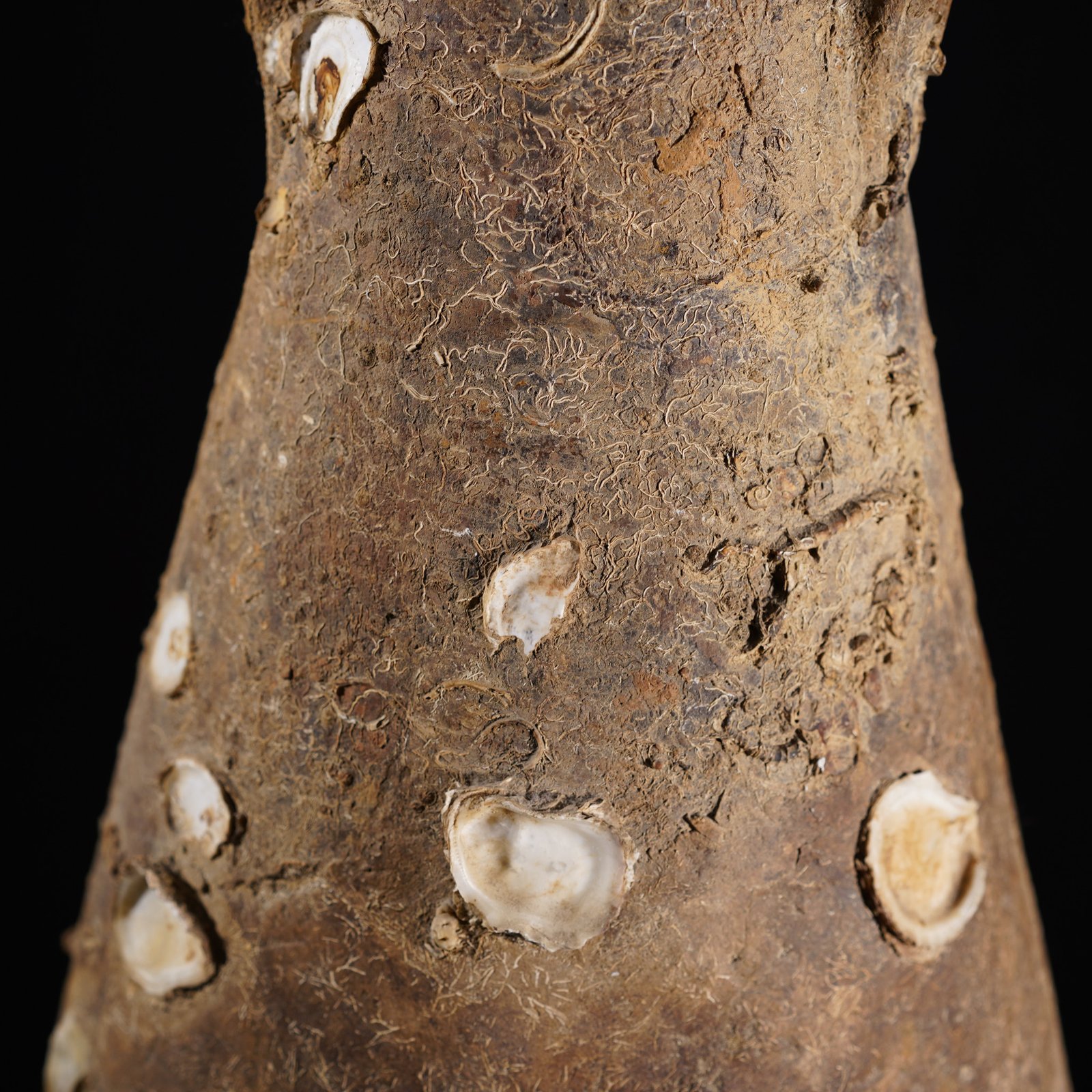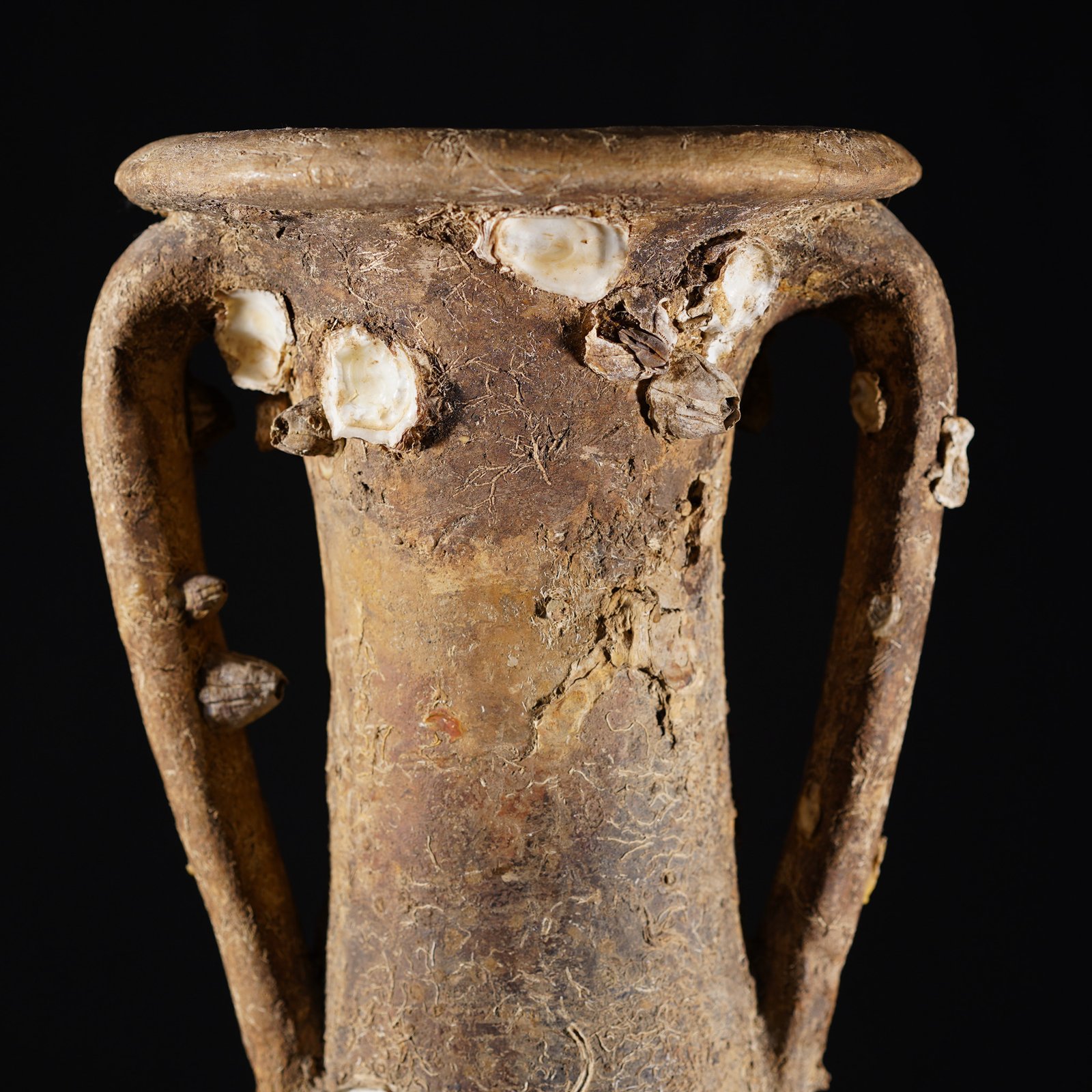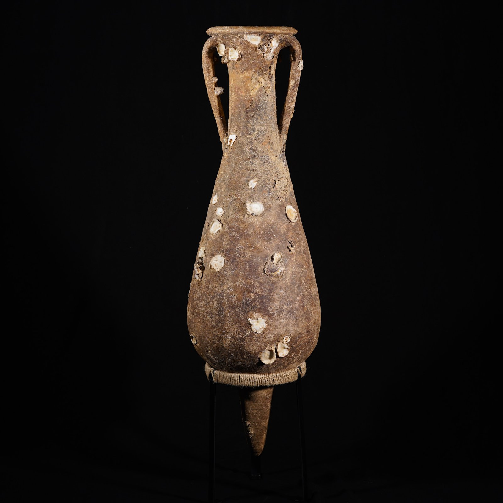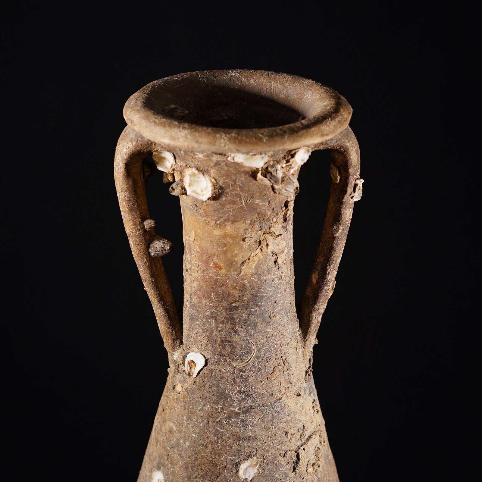 This amphora has an elongated body in the shape of an inverted pear (piriform), which gradually widens towards the base before narrowing at the pivot. Unlike variant IIA, IIB has a narrower, more elongated neck, often with a slightly hyperbolic profile that gives it a more elegant silhouette. The rim is flared (outwards) and usually has a triangular or rounded section, designed to facilitate sealing with ceramic or lime plugs. It has two oval-shaped handles that curve from the top of the neck to the shoulder of the piece. It ends in a solid point or ‘pivot’ that allowed the amphora to be stuck into the sand in the holds of ships or into the floor of warehouses to keep it upright.